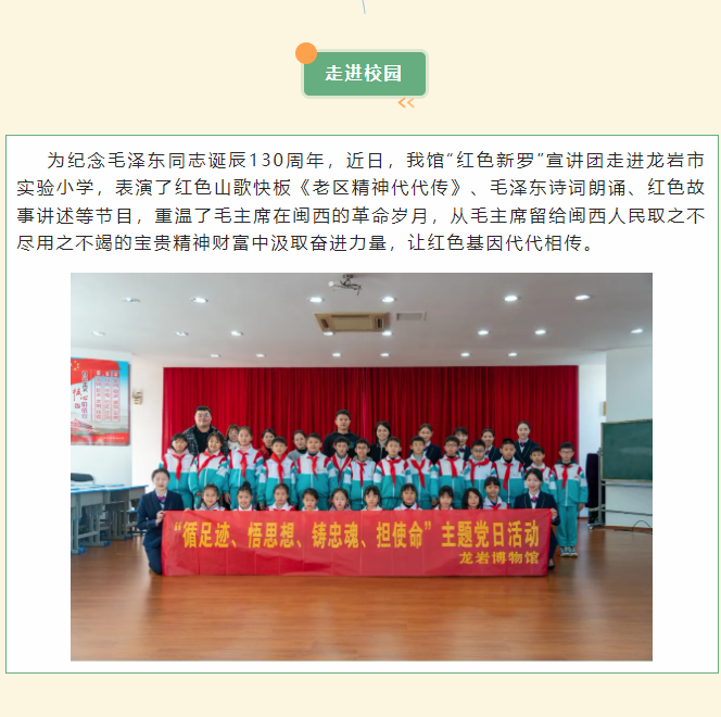 纪念毛泽东同志诞辰130周年丨龙岩博物馆“红色新罗”宣讲团走进龙岩市实验小学时间:2023-12-27